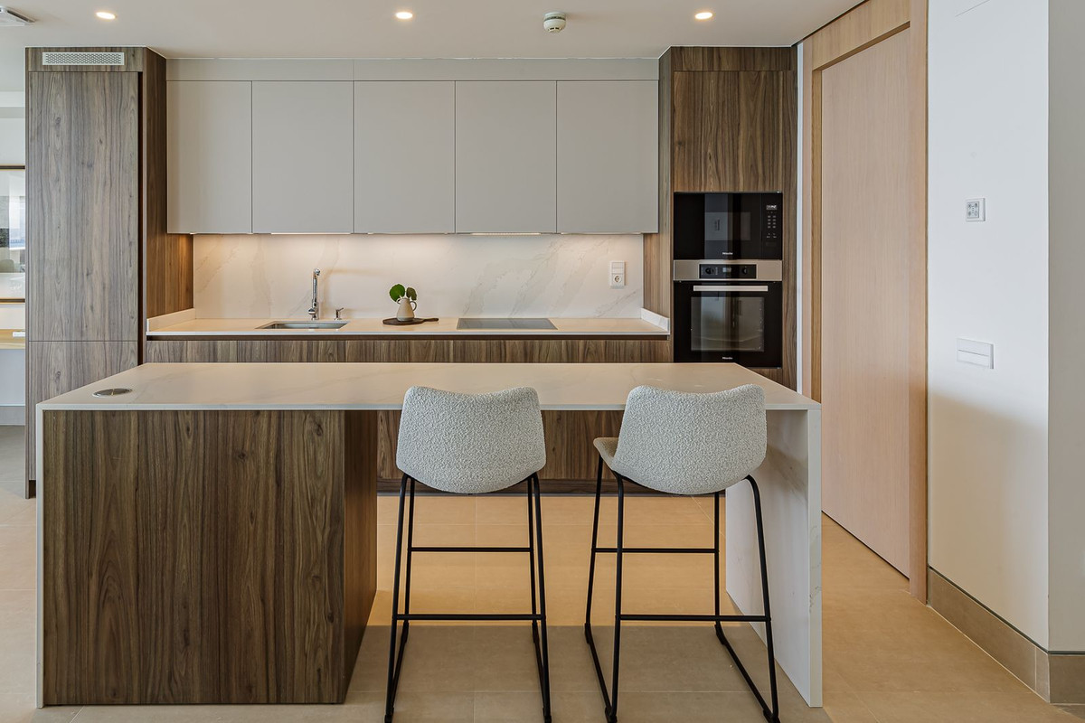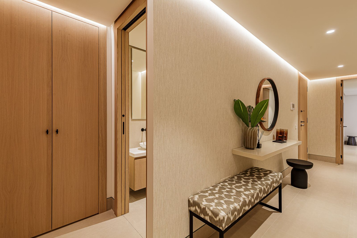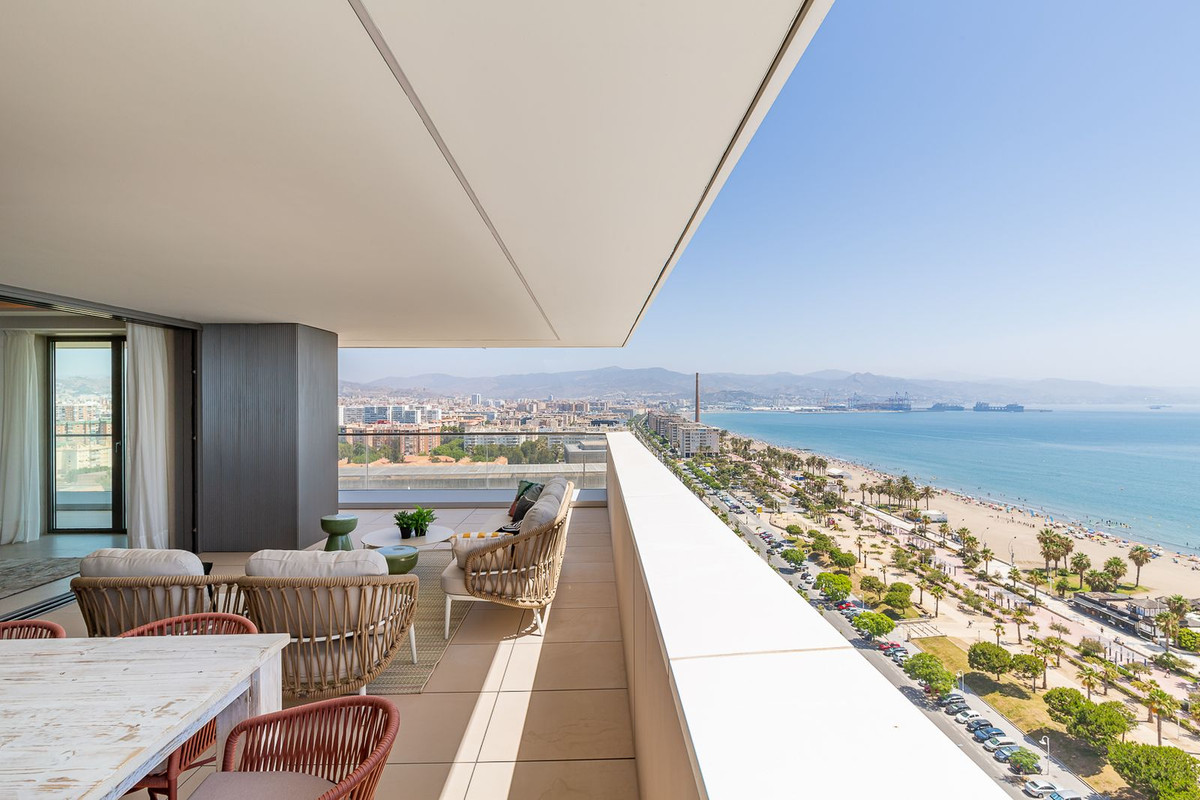 This brand new apartment is located on the 15th floor of the emblematic Málaga Towers, recently finished. Located in the front line of the beach and with stunning panoramic views, this job set a new standard in the luxury life in Malaga. The building, completed in 2024, has a 24-hour reception/concierge, an impressive rooftop pool on the 21st floor with a bar for residents use, heated indoor pool with solarium, free outdoor pool with separate solarium and Balinese beds, a spa area that incorporates another indoor pool heated, sauna, Turkish bath, cold water shower, tropical rain and ice fountain. Other advantages include a fully equipped gym with outdoor pilates area, children's play room and entertainment area, and a fully equipped coworking meeting room with separate terraces. The property is located on the 15th floor and offers amazing panoramic views. The apartment is sold fully furnished, consists of a spacious entrance hall, with guest bathroom, open plan living room, fully equipped kitchen of Gunni & Trentino with Miele appliances, huge covered terrace of 44 meters south facing with views of the Mediterranean and to the port of Malaga. The accommodation includes a master suite with sea views, a second bedroom with sea views and en-suite bathroom, and bedrooms three and four with shared family bathroom. Some of the most important features of the property are the ABB freehome domotic system, the Daikin air system for air conditioning, as well as underfloor heating and Bandalux blinds Somfy integration. Includes 2 parking spaces and storage room.