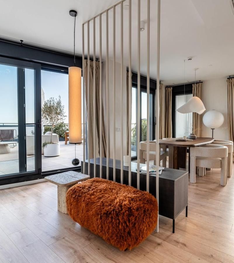 The apartment features a bright and functional layout, consisting of a spacious living and dining area with direct access to a private 12-square-meter terrace facing southwest. This orientation guarantees sunlight and natural brightness throughout most of the day, along with spectacular views of the urban skyline and coastline.