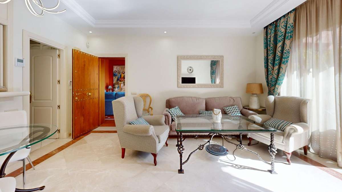 Upon entering, we are greeted by a large glazed terrace with orientation East, from which we can appreciate the views to the gardens and to one of the communal swimming pools, an ideal space to enjoy all year round. This terrace connects with a bright living room that leads to a second terrace, where the sun shines all morning.