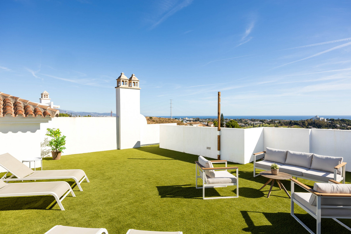 Introducing a truly exceptional south-facing penthouse in Paraiso Pueblo, Benahavís, where luxury living meets panoramic sea views. With a generous build area of 180 sqm, this fully furnished residence offers bright, open interiors complemented by extraordinary outdoor spaces that elevate the lifestyle experience. The penthouse features an impressive two-level terrace layout, culminating in a spectacular rooftop solarium that serves as a private sanctuary for sunbathing, entertaining, or simply enjoying the uninterrupted views of the Mediterranean. From sunrise to sunset, the south-facing orientation ensures abundant natural light throughout the home as well as warm, sunlit terraces all day long. Inside, the property offers three beautifully appointed bedrooms and two modern bathrooms, designed for comfort, style, and functionality. The living area flows seamlessly onto the terrace, creating a perfect harmony between indoor and outdoor living. With its high-quality furnishings, this home is ready to enjoy from the very first moment. Adding to its convenience, the penthouse includes a private garage parking space and a large storage room, providing both practicality and security. Situated within the sought-after community of Paraiso Pueblo, residents enjoy access to a spacious outdoor pool area with an on-site restaurant, as well as an indoor heated pool and a fully equipped gym. The charming village-style setting of the urbanization creates an atmosphere of tranquility while still being close to the vibrant offerings of Benahavís and the wider Costa del Sol. This penthouse represents a rare opportunity to secure a standout property that blends breathtaking views, luxury amenities, and exceptional design in one of the most desirable locations on the coast.