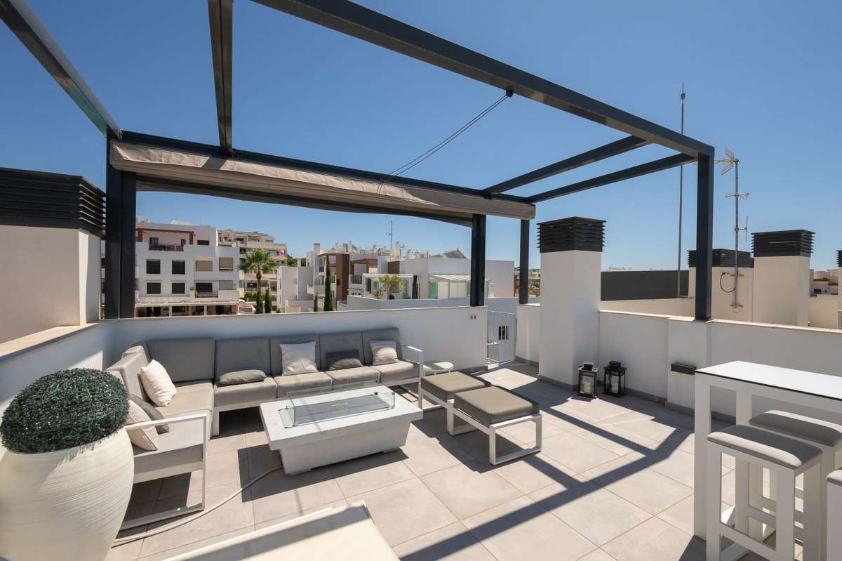 A rooftop solarium, perfect for sunset cocktails or morning yoga with breathtaking views of the Mediterranean Sea and La Cala town