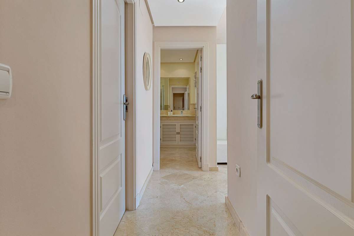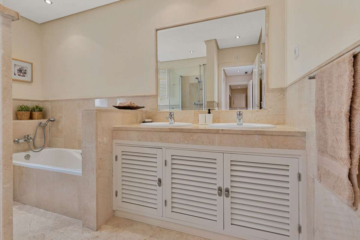 The master bedroom is both spacious and elegant, featuring direct access to the terrace, a large walk-in dressing room, and a luxurious en-suite bathroom with a walk-in shower and a bathtub with an additional shower overhead. The second bedroom is well-sized, with fitted wardrobes, and is served by an adjacent bathroom equipped with a large walk-in shower.