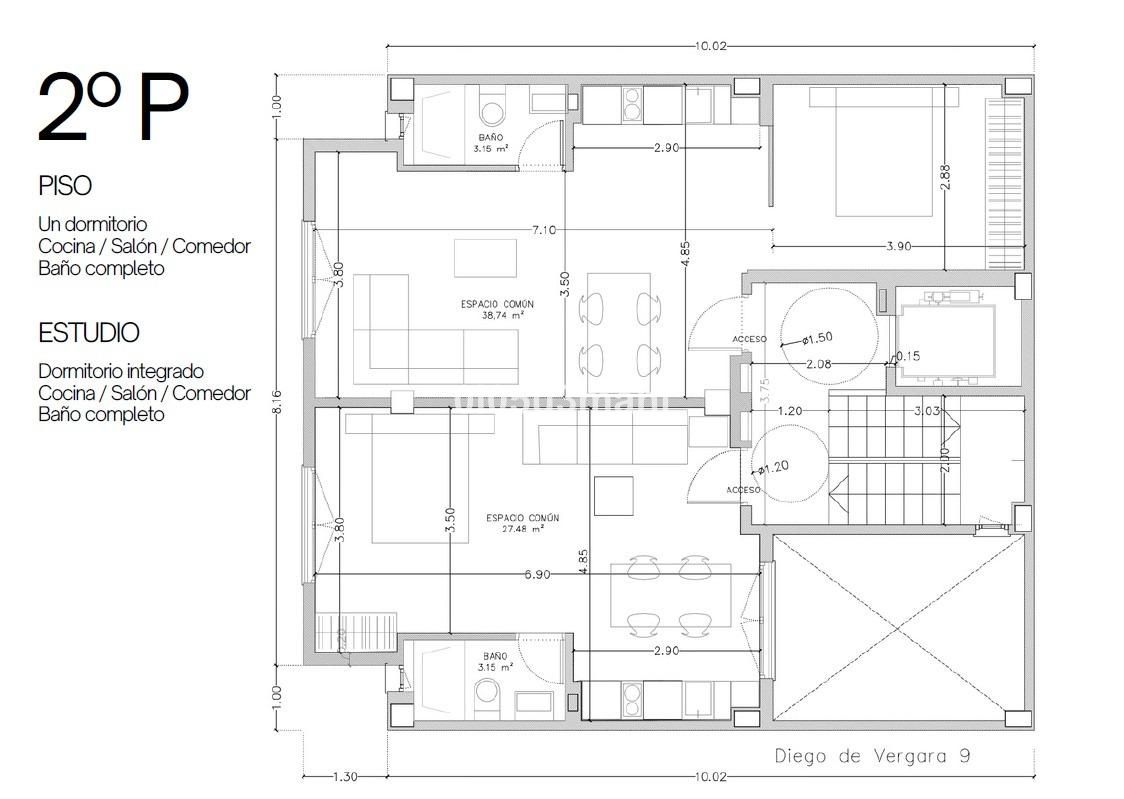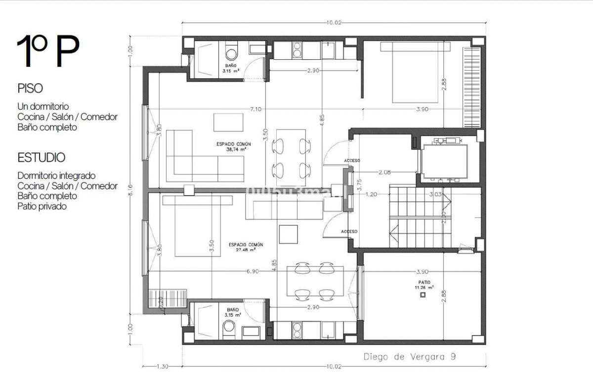 1. A 34.5 m² studio with a 12.8 m² private patio. 1st floor A