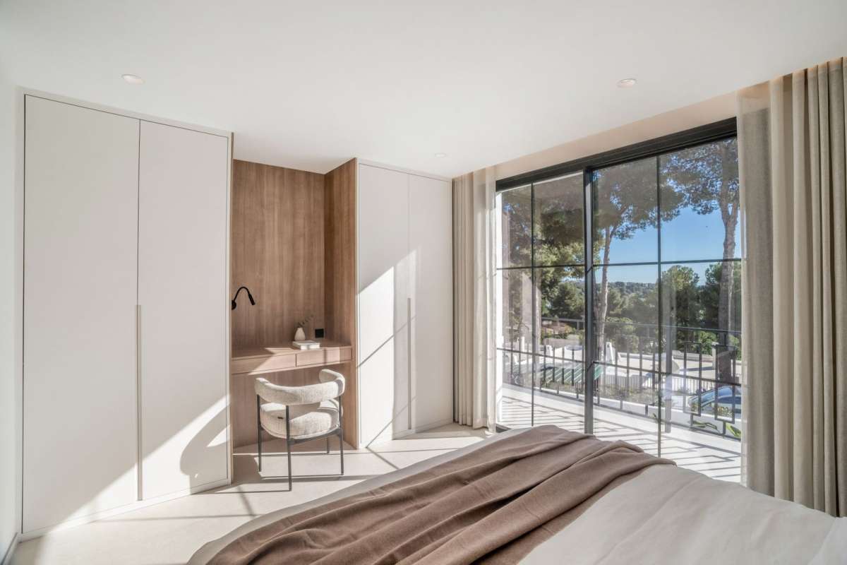 The upper floors host well-proportioned bedrooms, each with built-in wardrobes. The primary suite offers a private terrace with golf course views and an en-suite bathroom. Additional bedrooms provide comfort and privacy for family or guests, while the bathrooms are finished in a clean, modern style.