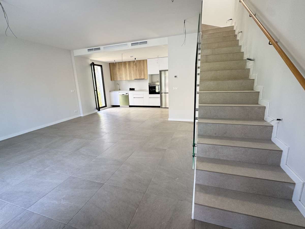The open-plan living space connects seamlessly to the fully fitted kitchen, which comes complete with modern appliances and high-quality cabinetry. A striking staircase with glass balustrade enhances the modern design and creates a bright, airy atmosphere.