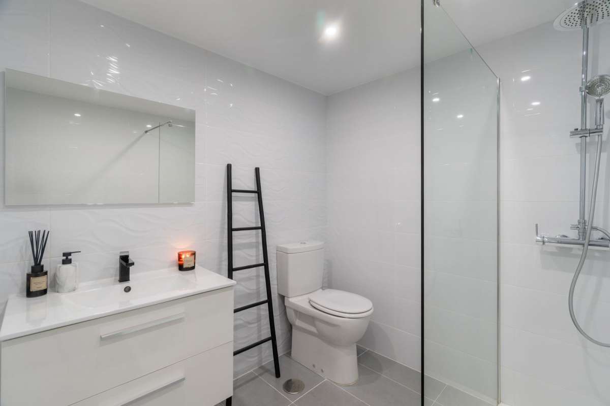 The lower-level features two well-proportioned double bedrooms. The master bedroom includes an en-suite bathroom with a walk-in shower and double vanity, offering both comfort and functionality. The second bedroom benefits from direct access to a private patio, adding a touch of outdoor tranquillity. A spacious family bathroom with a walk-in shower also serves this level, ensuring convenience for both residents and guests.