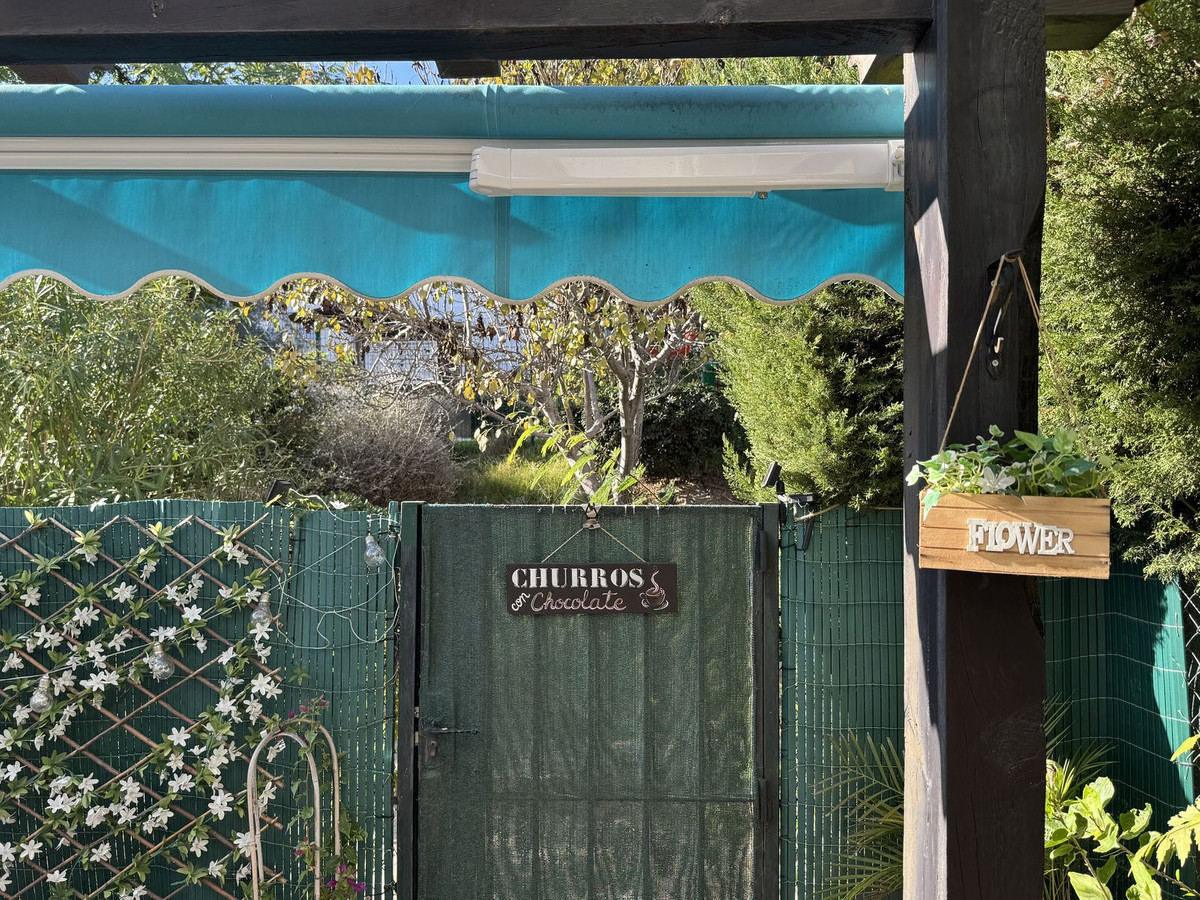 On the main level, you’ll find a large, modern fitted kitchen with timeless white gloss cabinetry, abundant storage, and a separate laundry area. There’s also a convenient guest toilet. The open-plan living and dining area features a cozy fireplace and French doors leading out to a sunny west-facing terrace and private garden, complete with a canopy for shade and direct access to the communal gardens and pool.