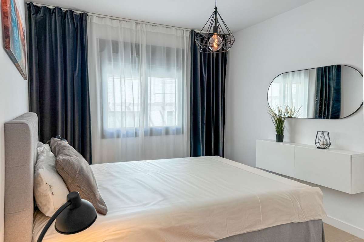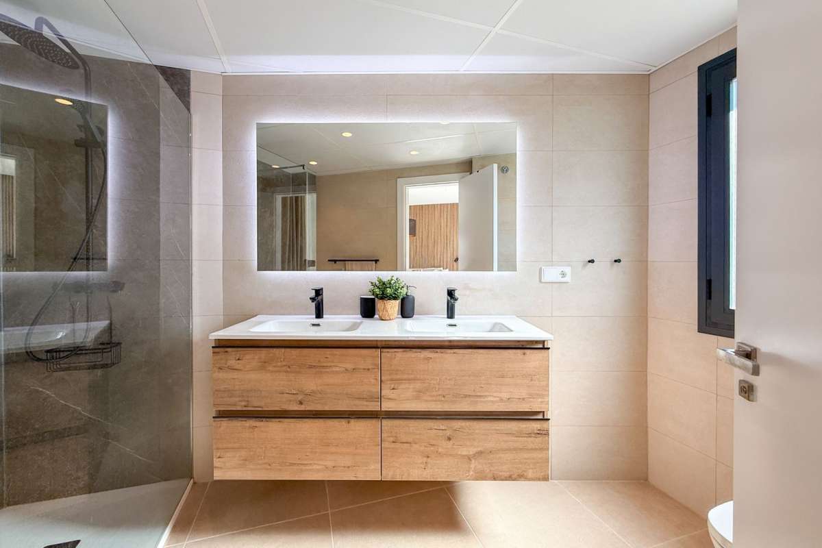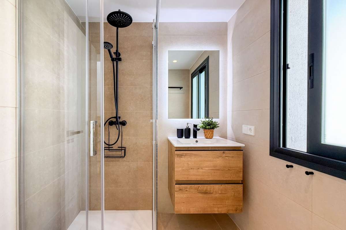 On the ground floor there is a modern kitchen, a bright living-dining room, one bedroom and a bathroom. From this level you can also access two large terraces on both sides of the house, perfect for enjoying the sun throughout the day.