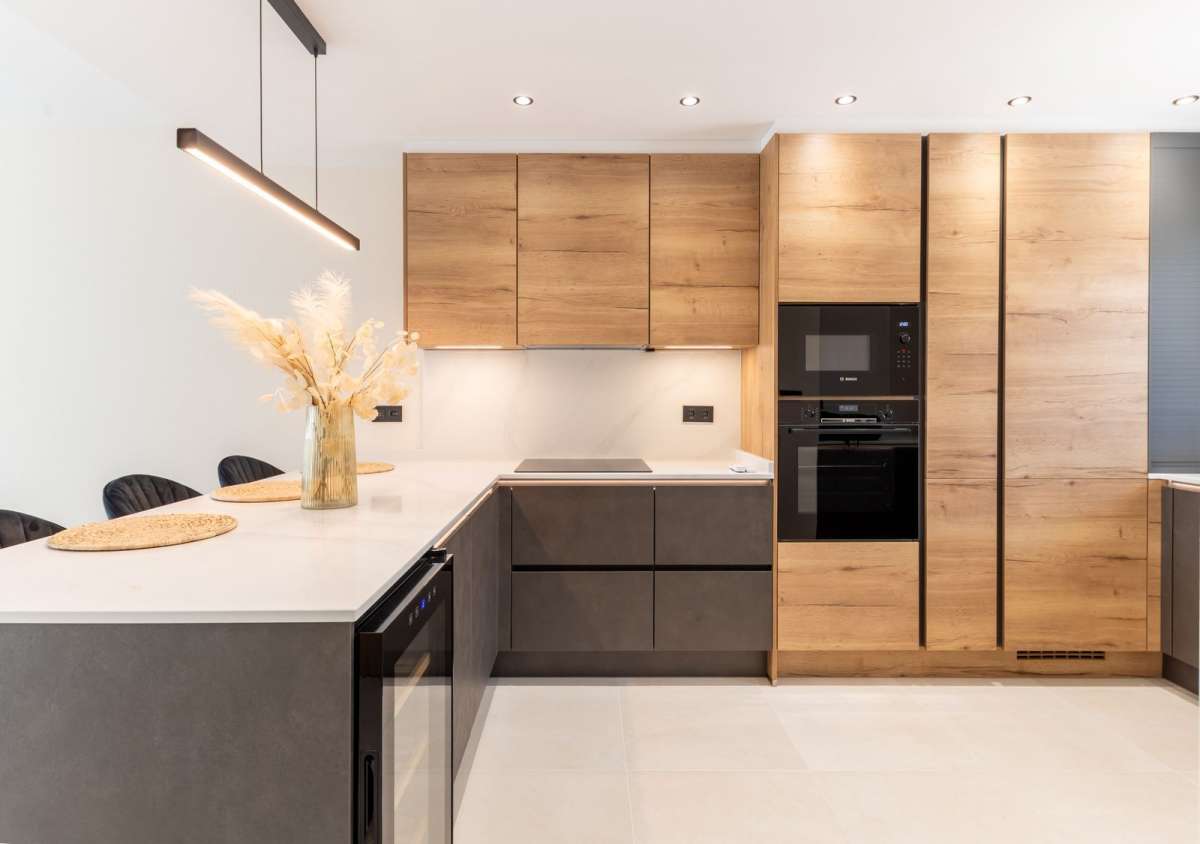 Inside, the property features a spacious open-plan layout combining the living room, dining area, and a fully fitted modern kitchen equipped with high-end integrated appliances and a wine cooler. A cosy fireplace anchors the living space, making it ideal for both entertaining and relaxing.