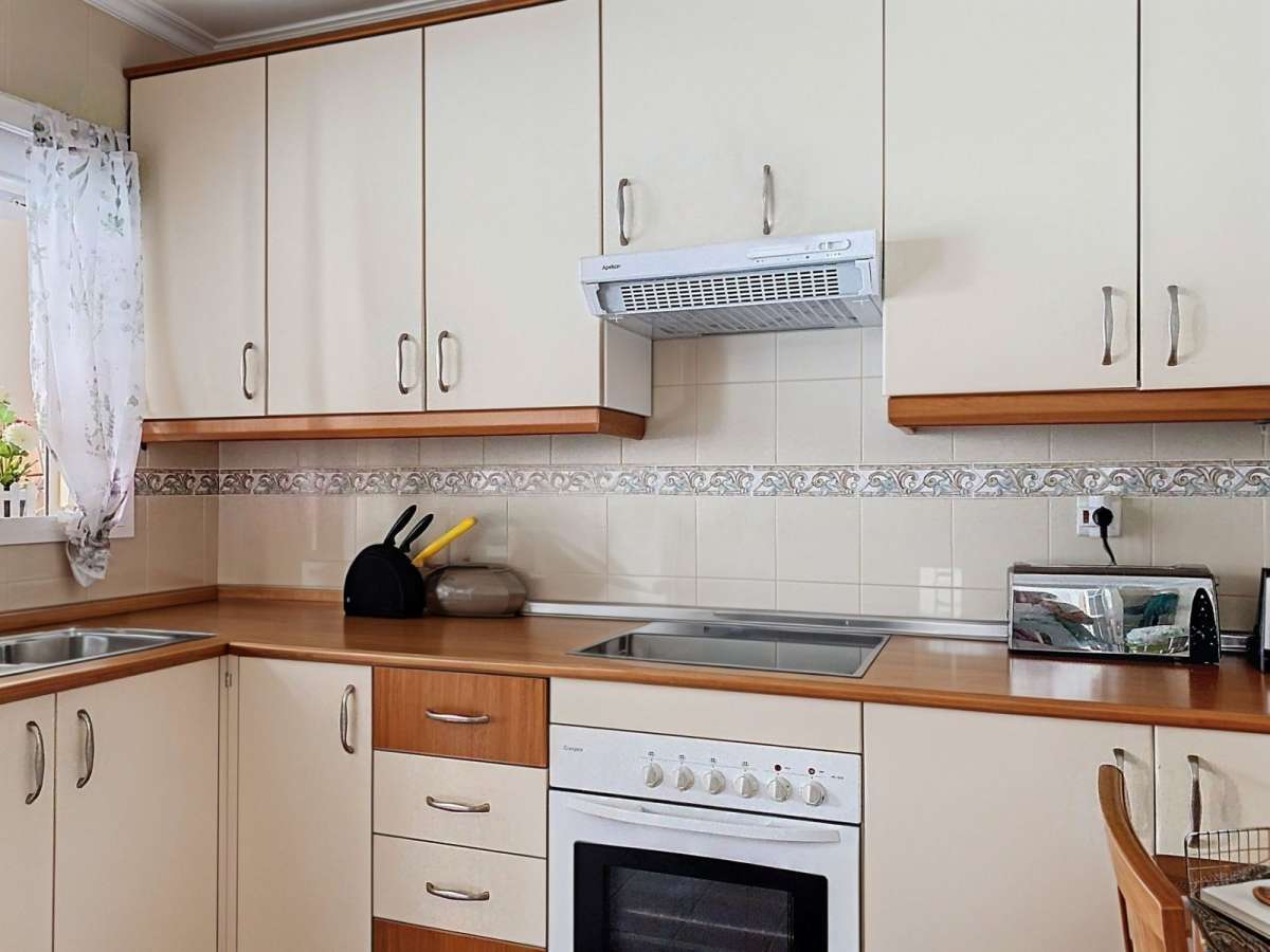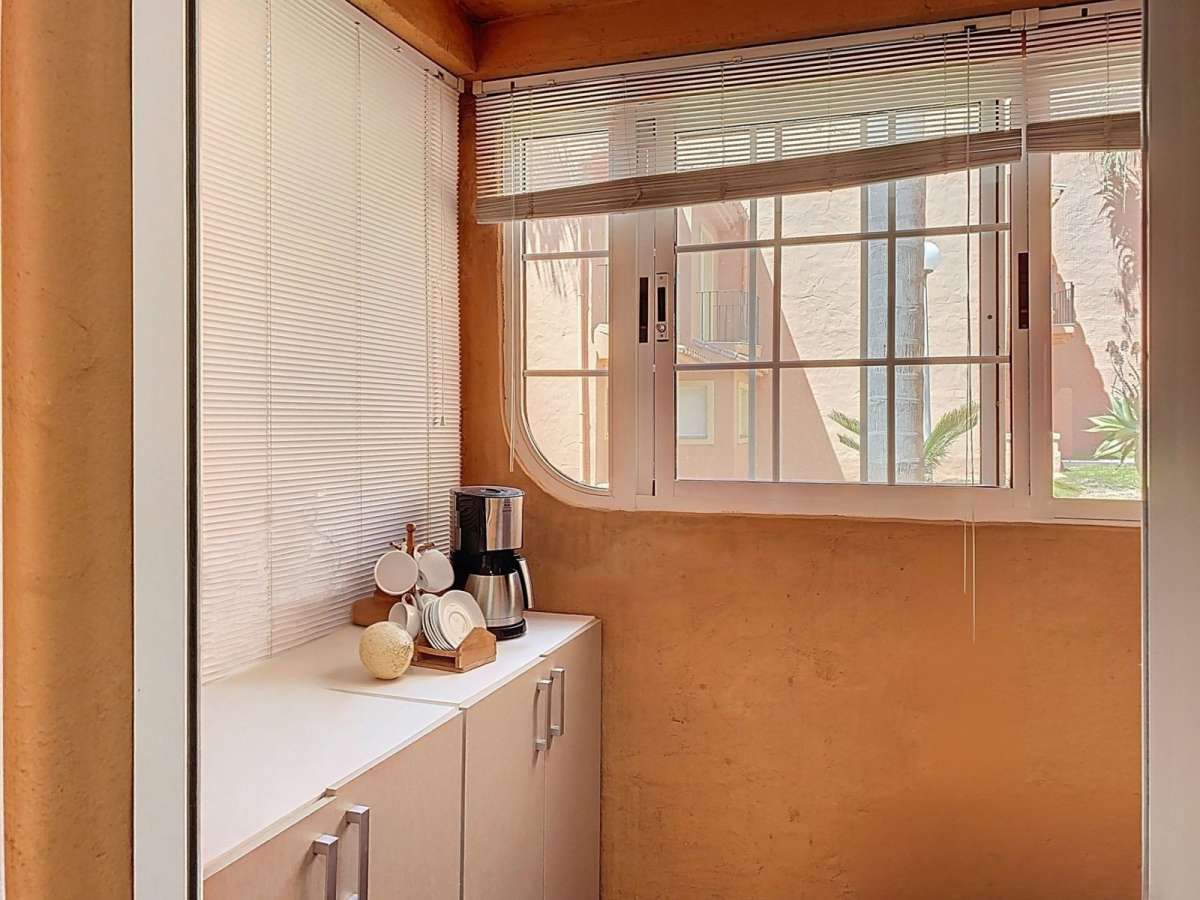 Upon entering, you are greeted by a welcoming hallway that leads into a bright and spacious living–dining area. Large glass doors open onto a generous terrace with breathtaking sea views, enclosed with glass curtains so it can be enjoyed comfortably all year round, adn with direct access to the community gardens and pool. This terrace is the perfect spot for al fresco dining, morning coffee with a sea breeze, or relaxing while watching the waves. The fully equipped separate kitchen includes a convenient laundry room, while a guest toilet completes this level.