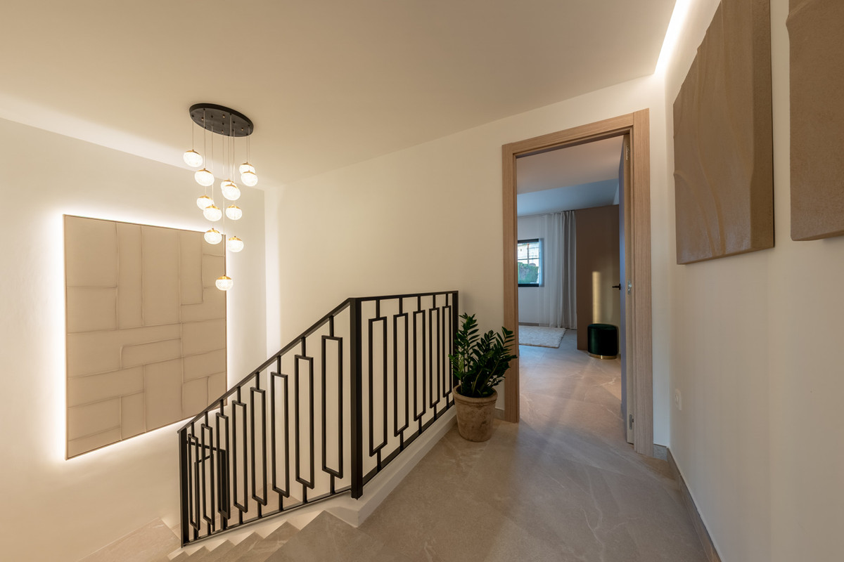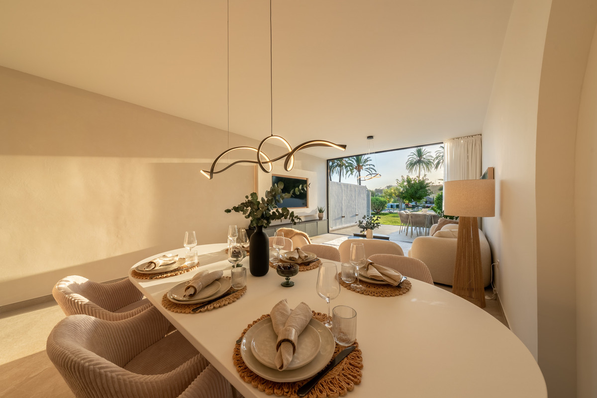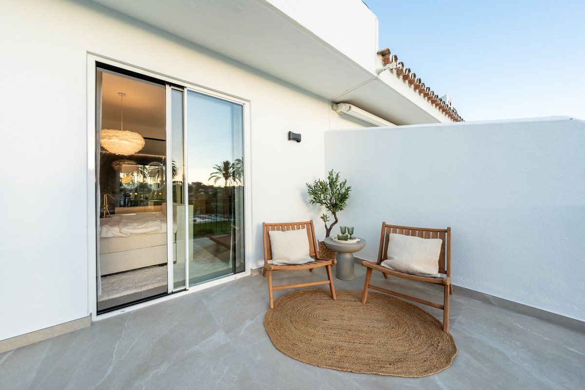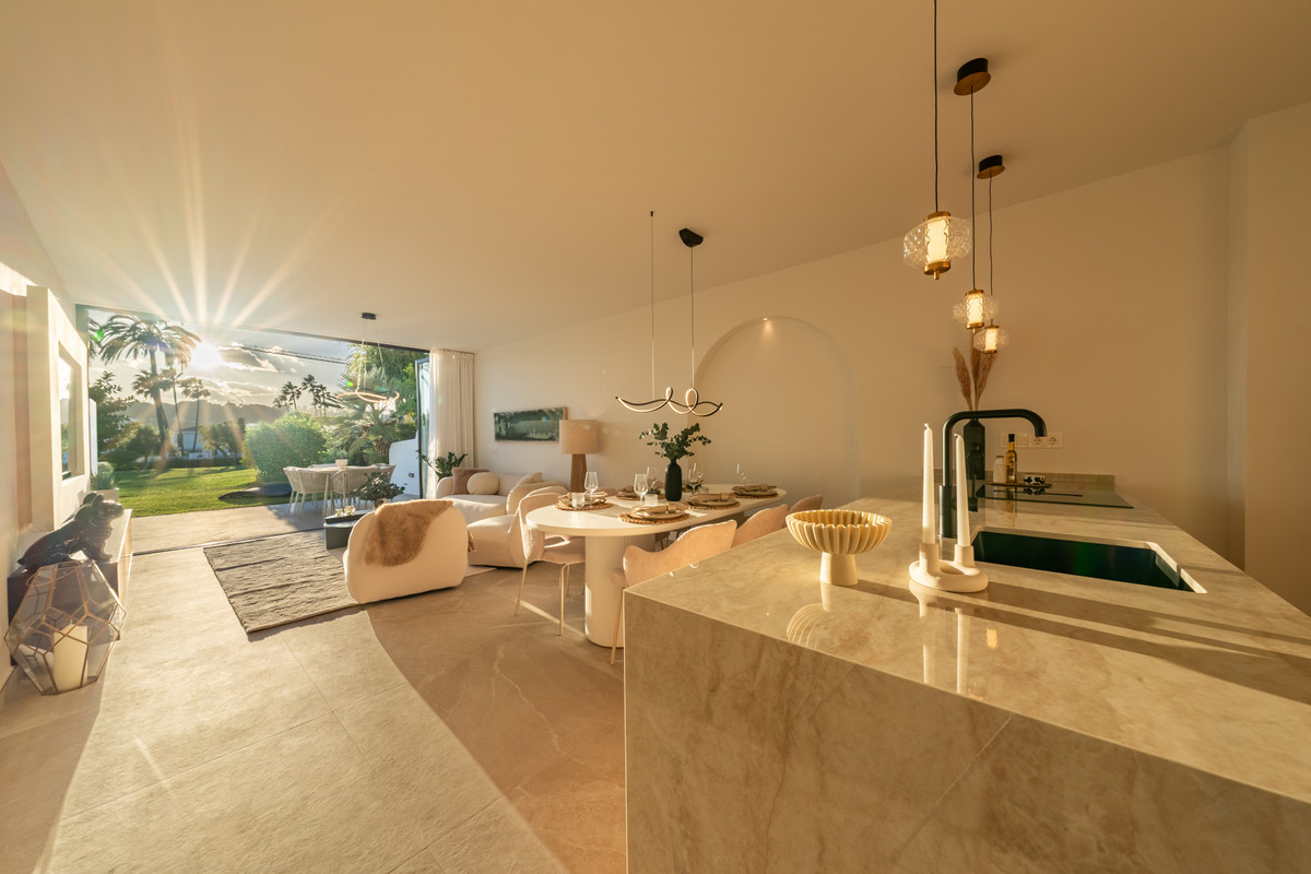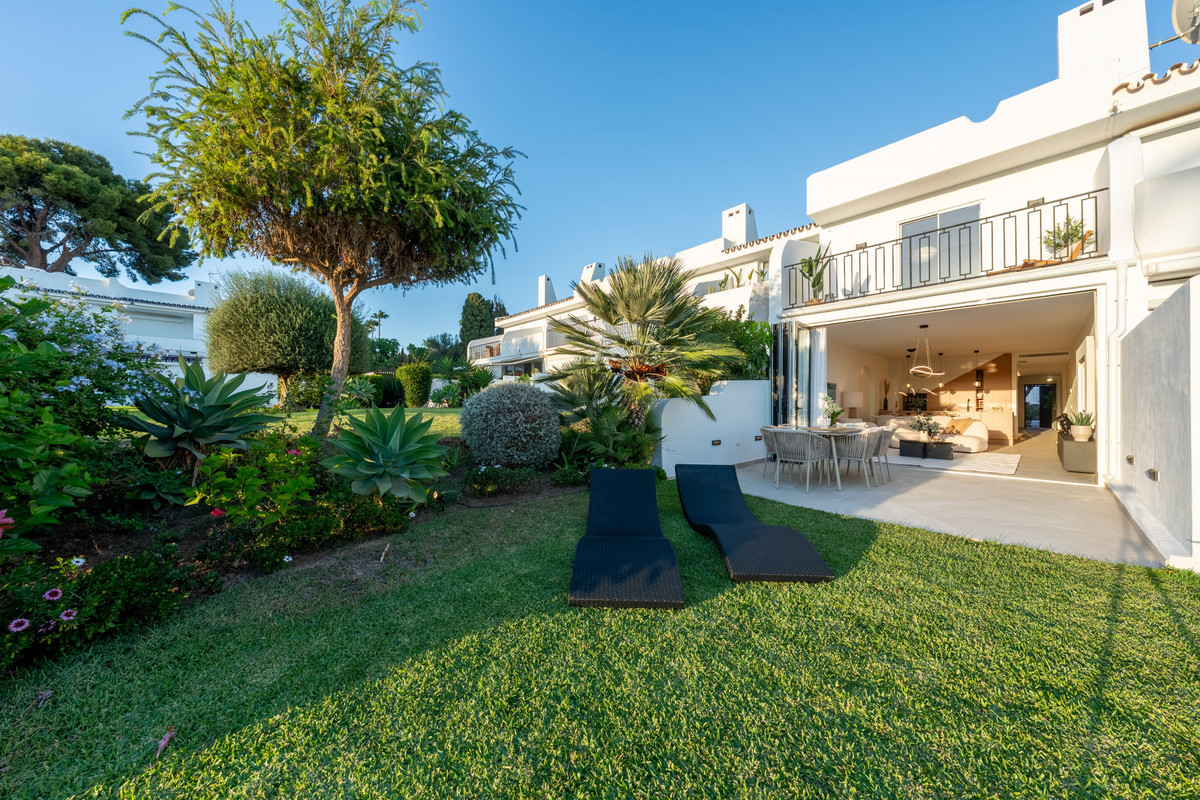 Experience effortless sophistication in this newly renovated 4-bedroom townhouse, nestled within the exclusive gated community of La Rinconada in the heart of Marbella’s Golf Valley. Designed with a modern Mediterranean aesthetic, the home exudes warmth and elegance. The open-plan living space features a bespoke kitchen with natural wood accents and Dekton finishes, flowing seamlessly into the dining and lounge areas. Expansive glass doors open to a private terrace and landscaped garden — perfect for relaxed al-fresco living. Upstairs, the serene master suite and guest bedrooms combine comfort and style, enhanced by refined materials and soft, neutral tones throughout. Set among lush tropical gardens with a beautiful communal pool, this home offers the perfect blend of tranquillity and convenience — moments from world-class golf courses, boutique shopping, and the vibrant life of Puerto Banús. A rare turnkey residence that captures the essence of contemporary Marbella living.