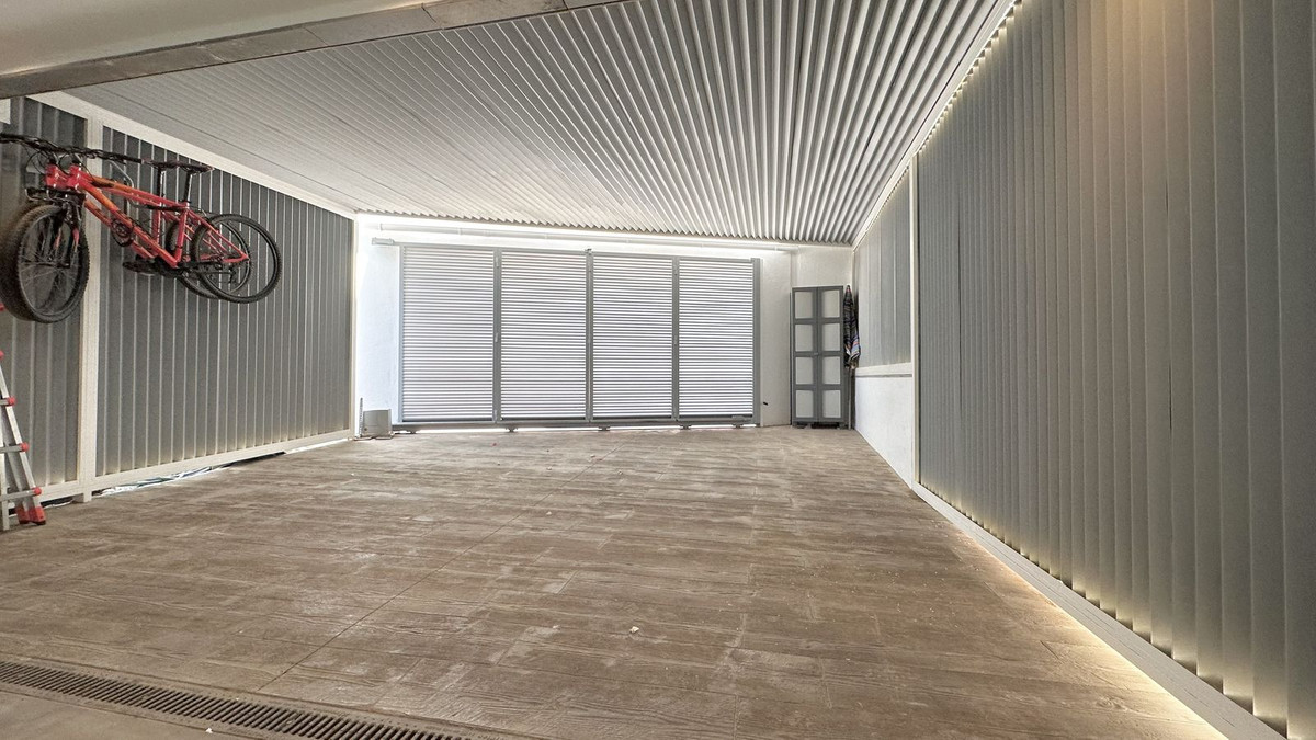 Outdoor dining terrace with BBQ. Private garage for 2 cars.