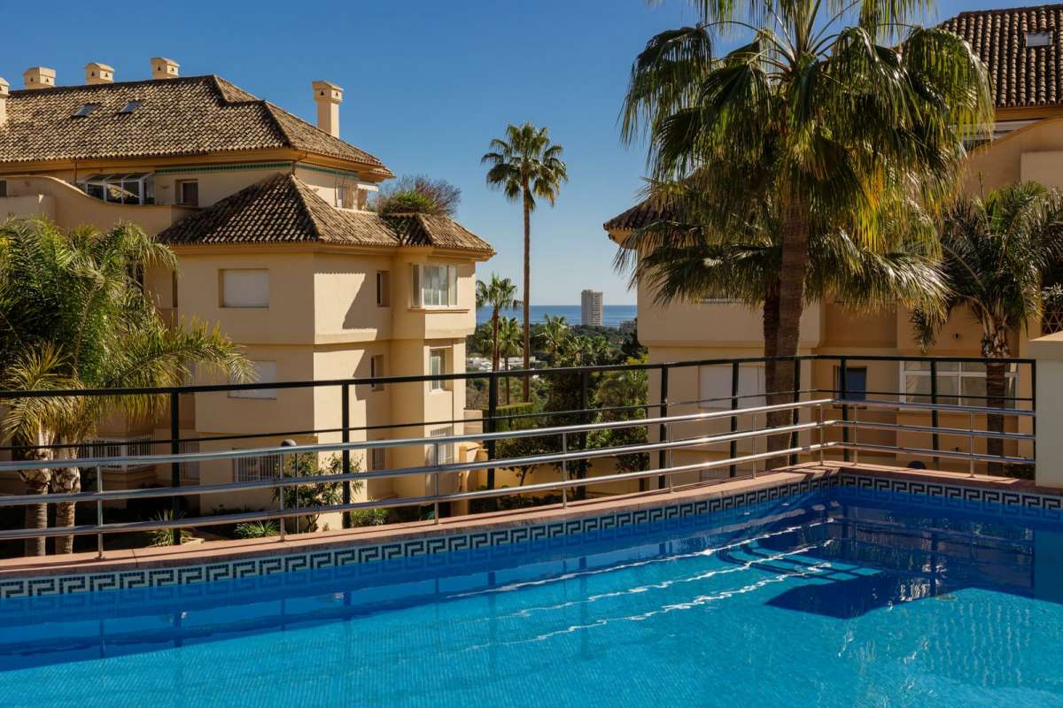 Beschrijving Functies appartement Elviria Golf Eerstelijn golf Nabij golf Nabij winkels Nabij school Gevel: Zuid Zeezicht Berg Panoramisch Tuin Zwembad Uitstekend Recentelijk vernieuwd Keuken: gedeeltelijk ingericht Omheind complex Elektrische zonwering Alarmsysteem Niet gemeubileerd Airconditioning Centrale verwarming Open haard Privaat Gemeenschappelijke tuin Gemeenschappelijk zwembad Overdekt terras Ingemaakte kledingkasten Nabij transport Prive terras Badkamer in slaapkamer Marmeren vloeren Lift Bekijk alles Locatie